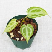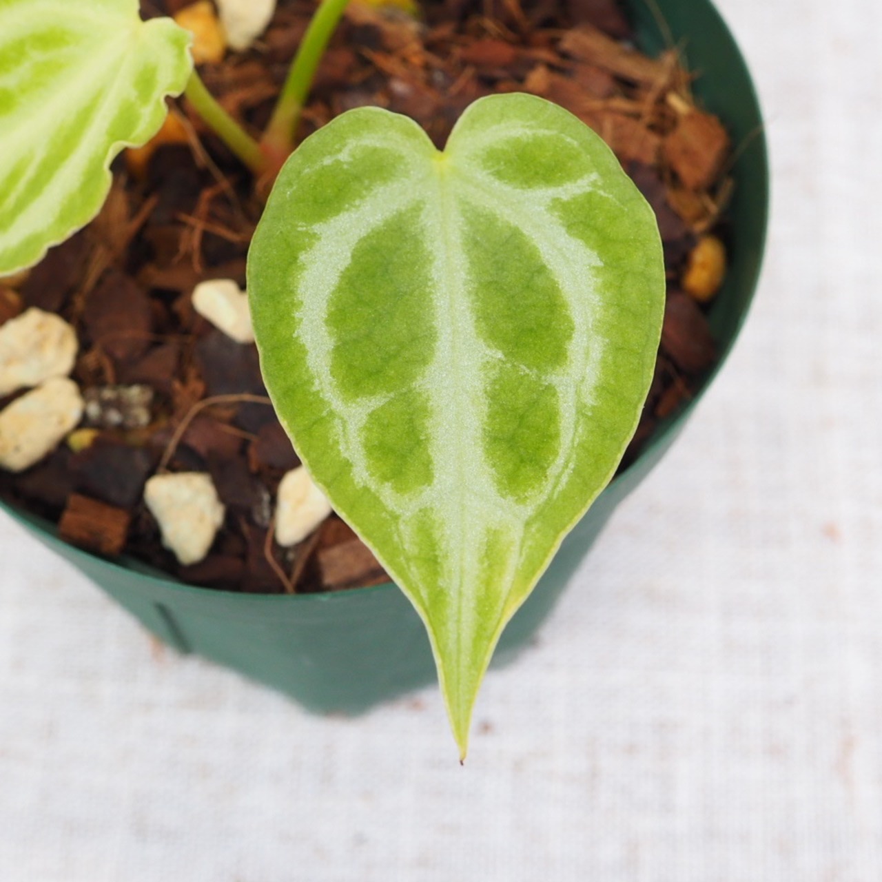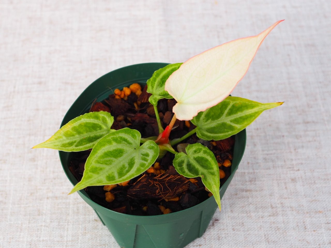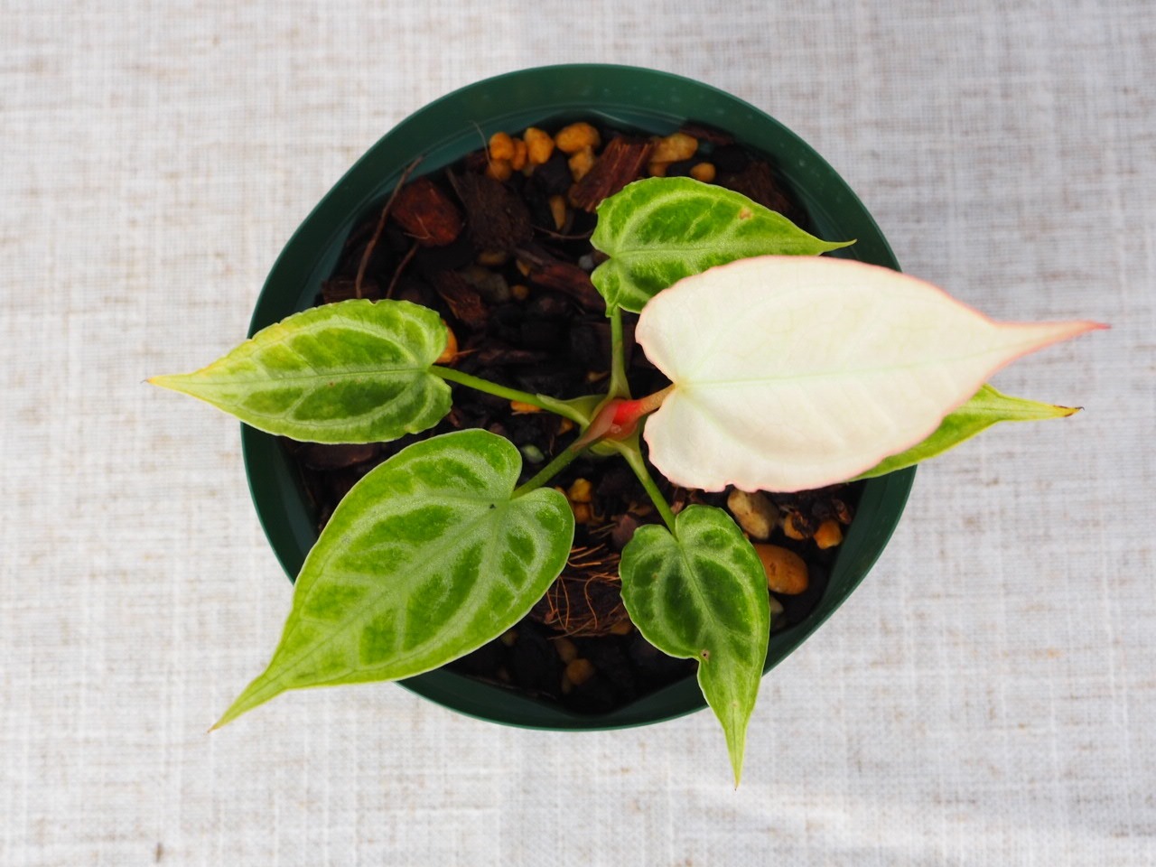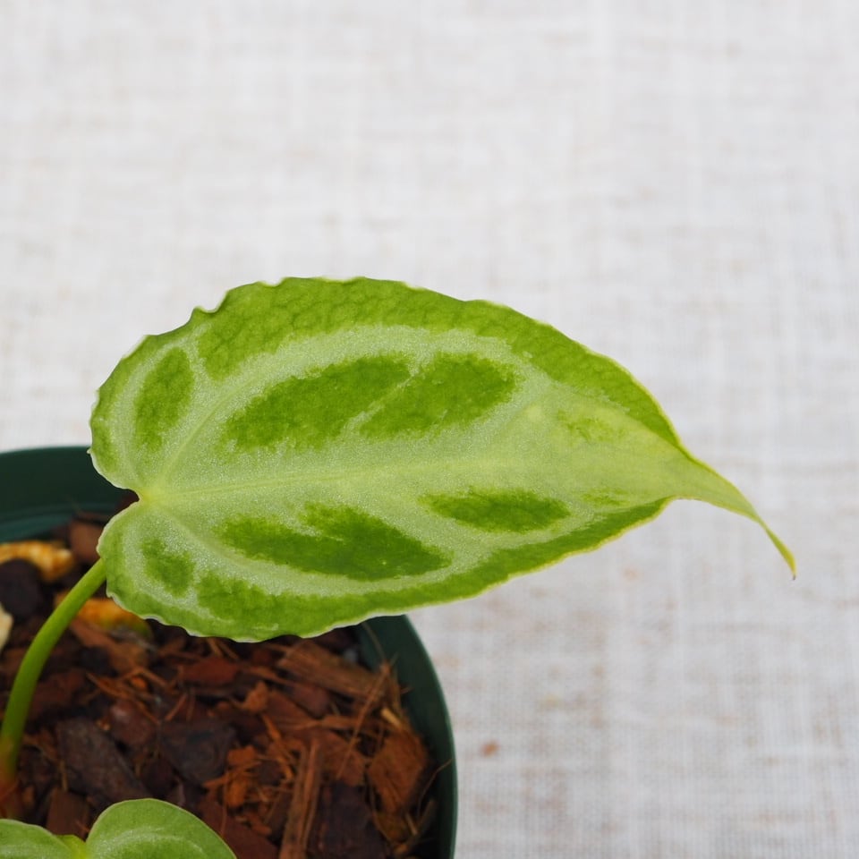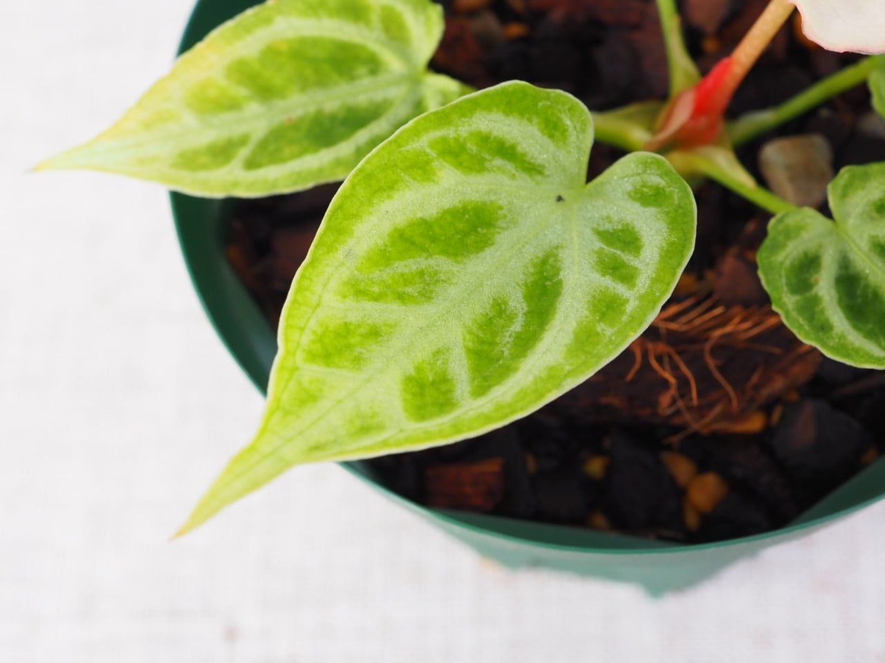 葉脈に沿った白く光沢のある模様が非常に美しいアンスリウム。